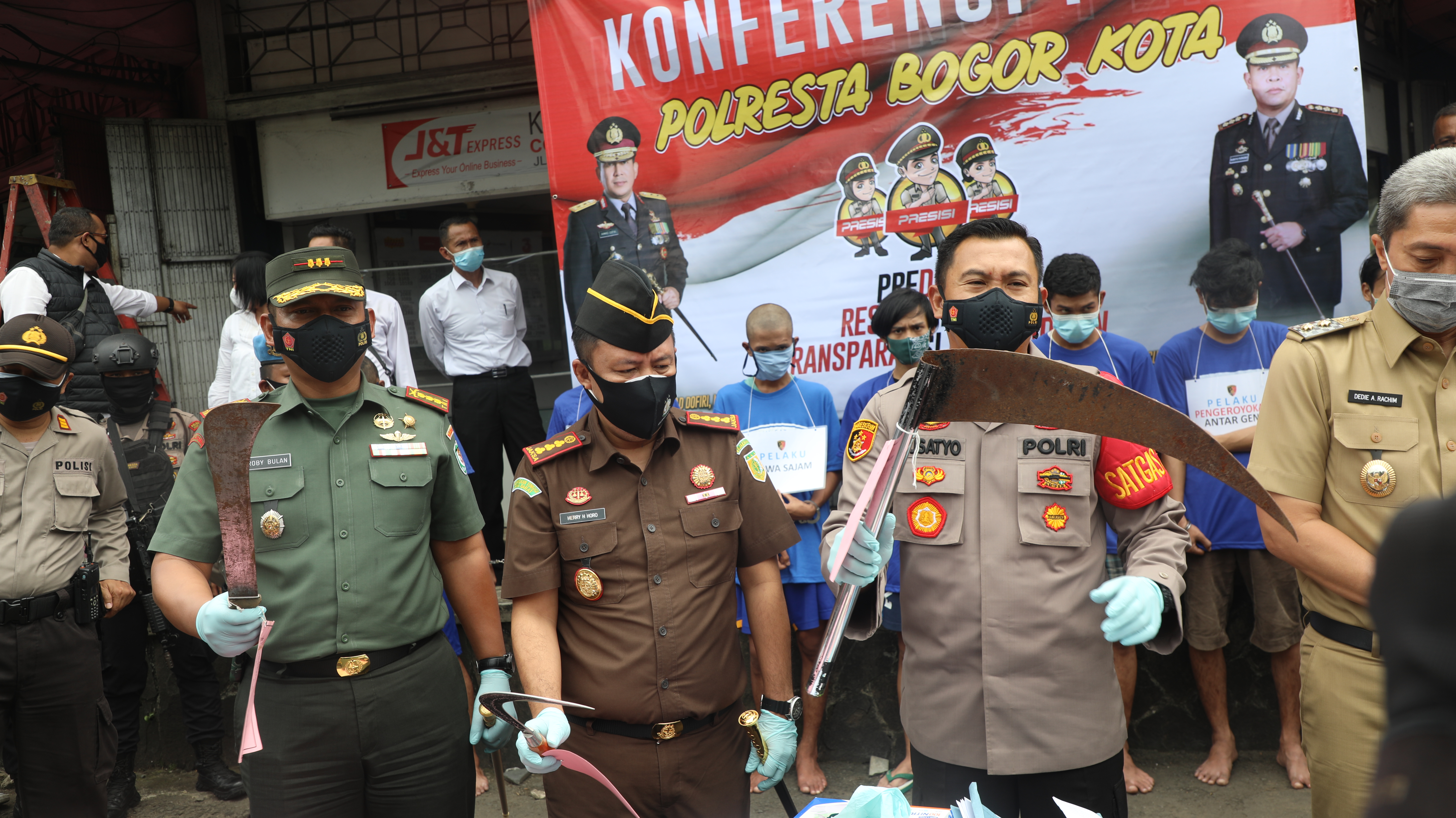 Rilis pelaku tindak pidana kekerasan dan kepemilikan senjata tajam tersebut dilakukan dengan tetap menerapkan protokol kesehatan. Dalam kesempatan itu Kapolresta Bogor Kota Kombes Pol Susatyo Purnomo Condro menegaskan pihaknya tidak segan menindak dan menangkap para pelaku kriminalitas tak terkecuali para pelaku tawuran atau geng motor yang meresahkan masyarakat. "Melalui kegiatan ini kami mengimbau kepada semua masyarakat baik perorangan ataupun kelompok untuk tidak lagi bermain kekerasan di Kota Bogor, tentunya kami TNI-Polri dan semua stalkholder akan melakukan tindakan tegas terhadap kelompok-kelompok masyarakat yang mengedepankan cara cara kekerasan," ujarnya. Baca juga: BREAKING NEWS - 6 Orang Genk Motor Kota Bogor Ditangkap, Seperti Ini Tampang Pelakunya Tak hanya itu melalui Tim khusus Kujang pihanya juga akan terus menekan tingkat agresivitas dari masyarakat sehingga Kota Bogor lebih nyaman untik warga tinggal. "Setiap hari ada 30 personel yang kami turunkan untuk memonitor di semua lokasi-lokasi tempat berkumpulnya kelompok-kelompok yang kami identifikasi dengan mudahnya membawa senjata tajam berkeliling kota dan sebagainya tentunya ini sudah di luar batas tolerasnsi dan akan kami tindak," ujarnya. Selengkapnya...