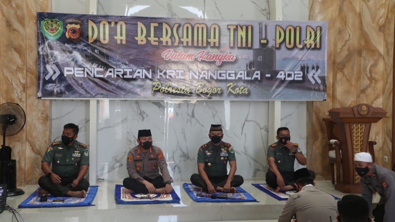 Bogor Kota - Kapolresta Bogor Kota bersama Kombes Pol Susatyo Purnomo Condro, Danrem Suryakencana 061 Bogor Brigjen TNI Ahmad Fauzie, Dandim 0606 kota Bogor Kolonel Robby Bulan, Dandenpom Bogor Letkol Cpm Sutrisno dan perwakilan Lanud Angkatan Udara ATS Bogor yang dihadiri kurang lebih 20 personil TNI Polri menggelar doa bersama yang dipimpin langsung oleh Kompol H.Komarudin sebagai Kasat Binmas Polresta Bogor Kota keselamatan bagi awak KRI Nanggala-402 yang hingga kini belum ditemukan. Dan juga kela caran serta kemudahan kepada team gabungan dalam upaya pencarian kapal selam dimaksud. Selengkapnya...